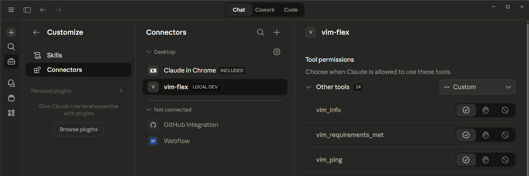 If the "vim-flex" connector is missing from your Claude conversation: