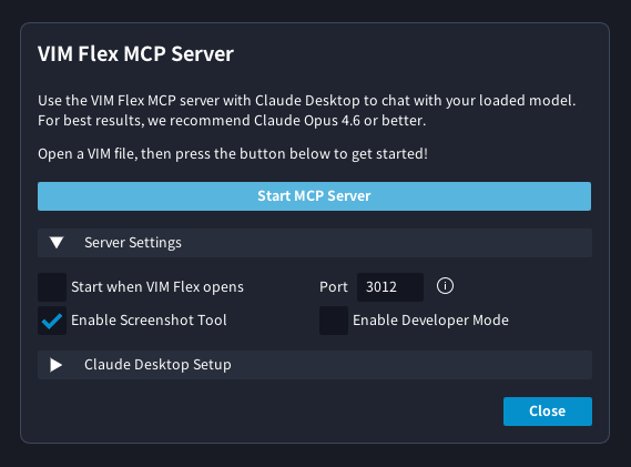 To create custom scripted plugins and workflows with Claude, you must enable "Developer Mode". To do this, click on "Enable Developer Mode" in the VIM Flex MCP Server dialog.