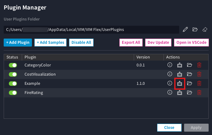 In "Developer Mode", the Plugin Manager exposes a Dev Update button. Pressing it copies the read-only sample plugins shipped with VIM Flex (located at C:\Program Files\VIM\VIM Flex\SamplePlugins\) into your user plugins directory, seeding it with working reference implementations you can study and modify.