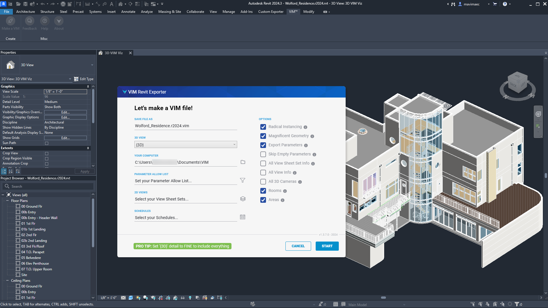 In the VIM Revit Exporter dialog, set the options below as desired, then click Start.